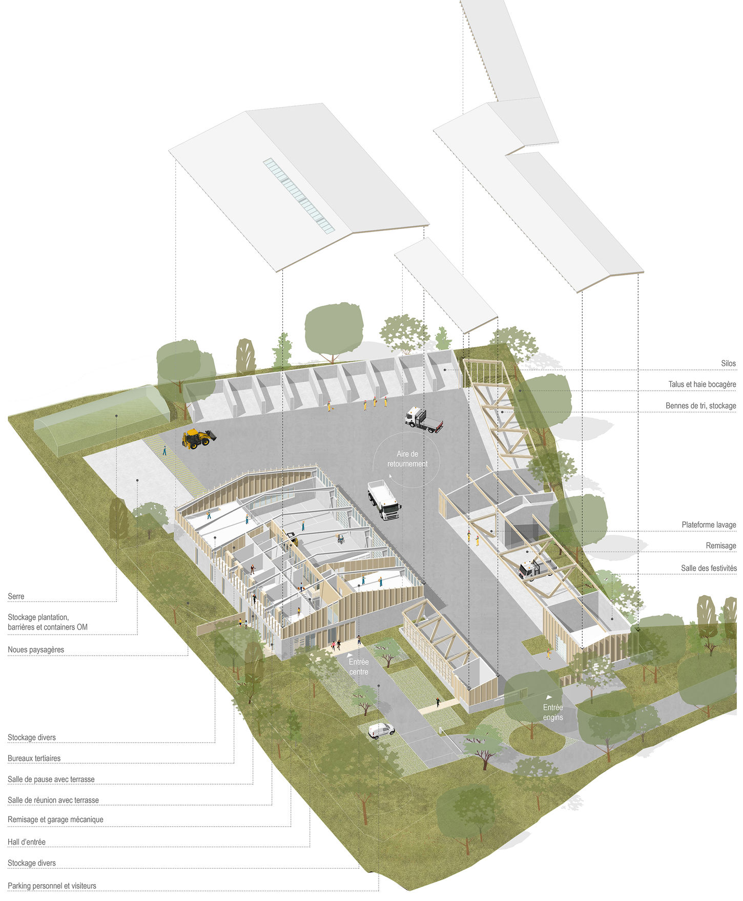 Le nouveau centre technique municipal de brec’h, positionné à l’emplacement actuel du hangar, s’installe humblement sur la parcelle. Préservant au maximum le patrimoine végétal existant lorsque cela est compatible avec la charte des communes forestières, sa présence se fait discrète. A peine perceptible depuis la route de Lann Er Rheu, nous avons maintenu les continuités vertes pour préserver la biodiversité présente et à venir sur ce site.