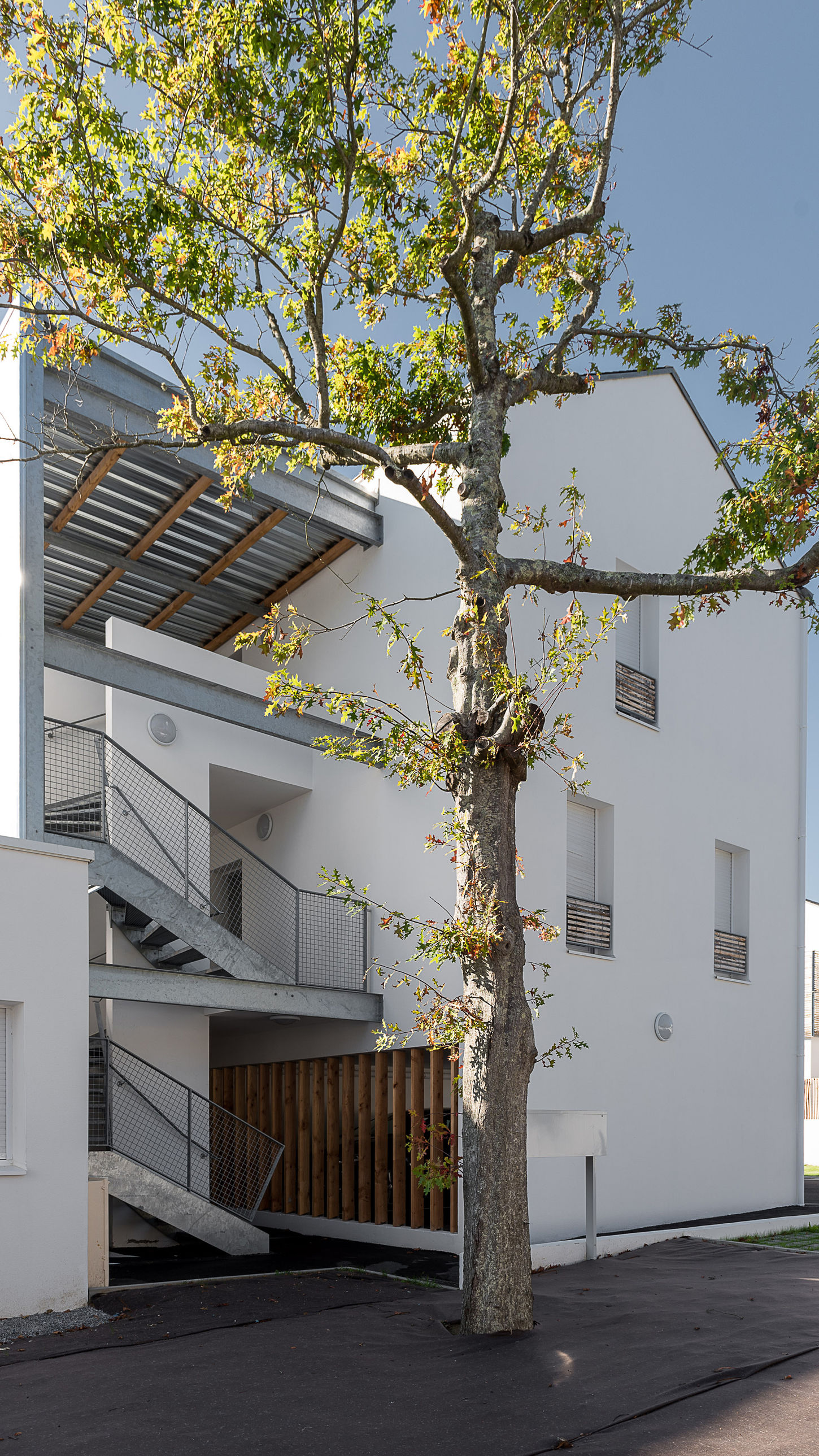 La couleur dominante des constructions est le blanc. Le polycarbonate vient également habiller ponctuellement certaines parties du projet, notamment en couverture et en habillage latéral (partiel) des cages d’escaliers extérieures, apportant de par sa translucidité de la lumière naturelle. Des claustras composés de montants en bois clair viennent structurer certains vides, dessinant les limites entre les espaces publics et privés des stationnements ou des accès aux logements par exemple. La ganivelle est employée comme clôture et en parement des garde-corps. Une partie des arbres présents sur le site a pu être conservé.